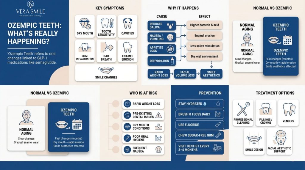 Patients travelling to Turkey for dental treatments while using Ozempic should ensure their treating clinic is aware of their medication status. Clinics like Vera Smile are experienced in assessing GLP-1 users and developing treatment plans that account for the oral health dynamics of this patient group.